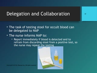 The Patient Care Technicians primary function is to assist and support the Professional Registered Nurse in all aspects of direct and indirect patient care activities. Which of the following actions should the nurse take. Obtain specimens from 3 different stools.